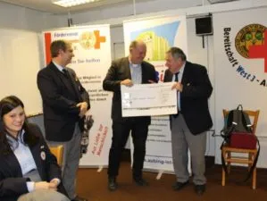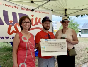 „Aubing ist in“ unterstützte die Helfenden Hände im Westkreuz mit einer Spendensammlung Die blauen Schweinchen standen in den Geschäften, die eine Spendeneinnahme von 1.000 Euro erbrachten. Der Scheck wurde vom 2. Vorstand Stefan Pfeiffer beim Neuaubinger Strassenfest überreicht.
